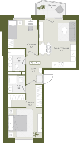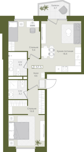 57,5 м²