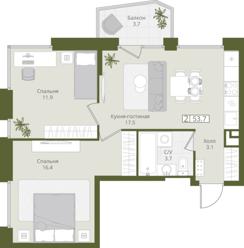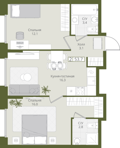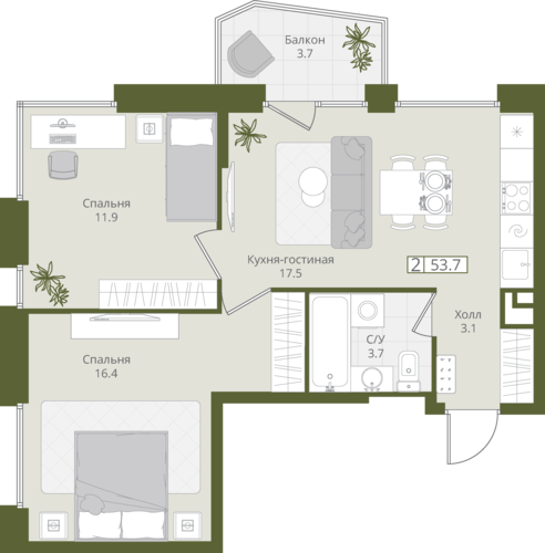 53,7 м²