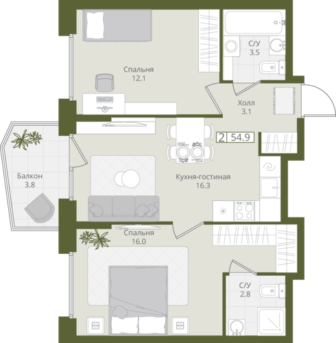 54,9 м²