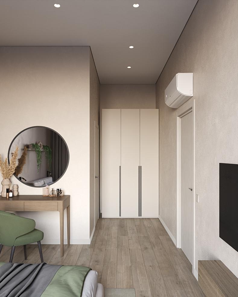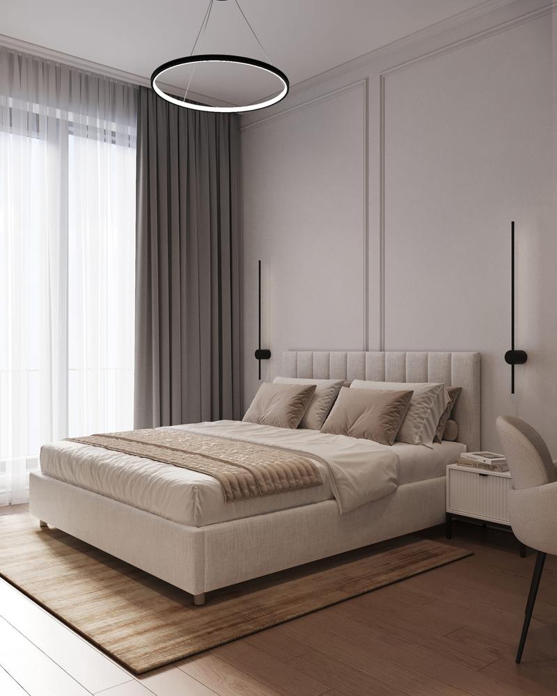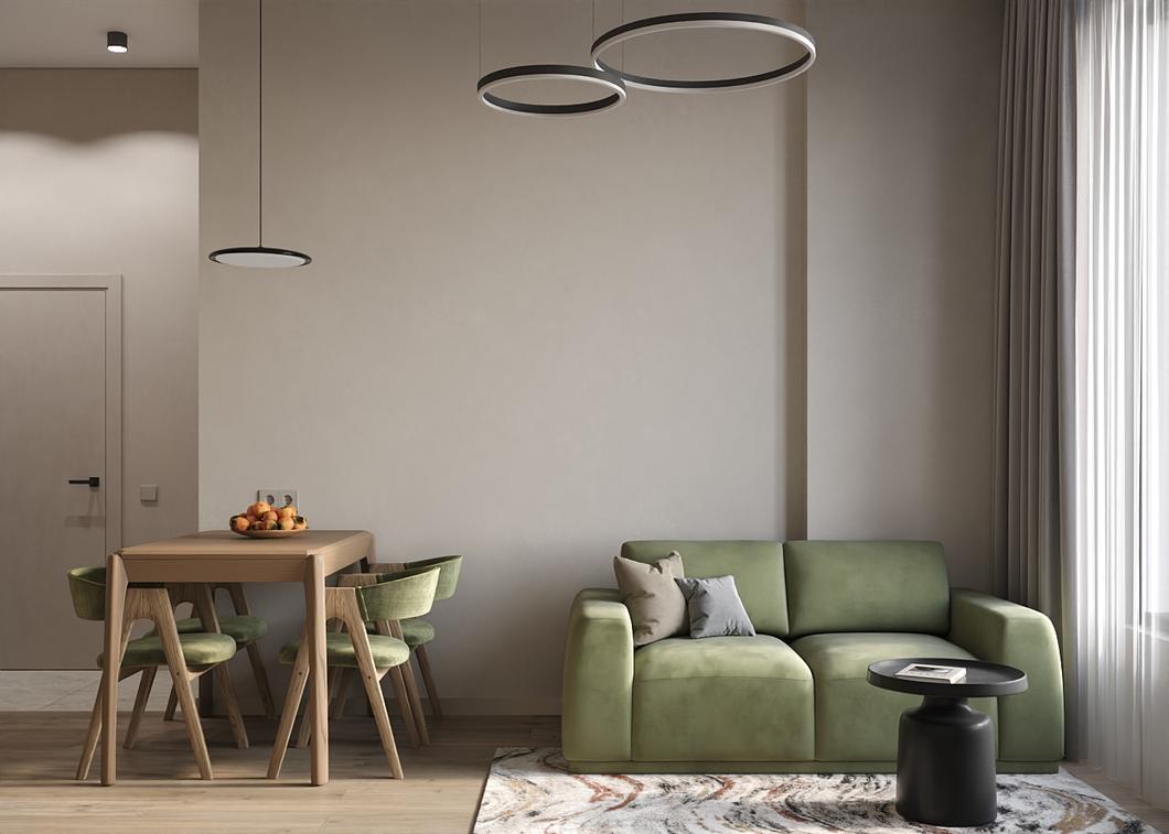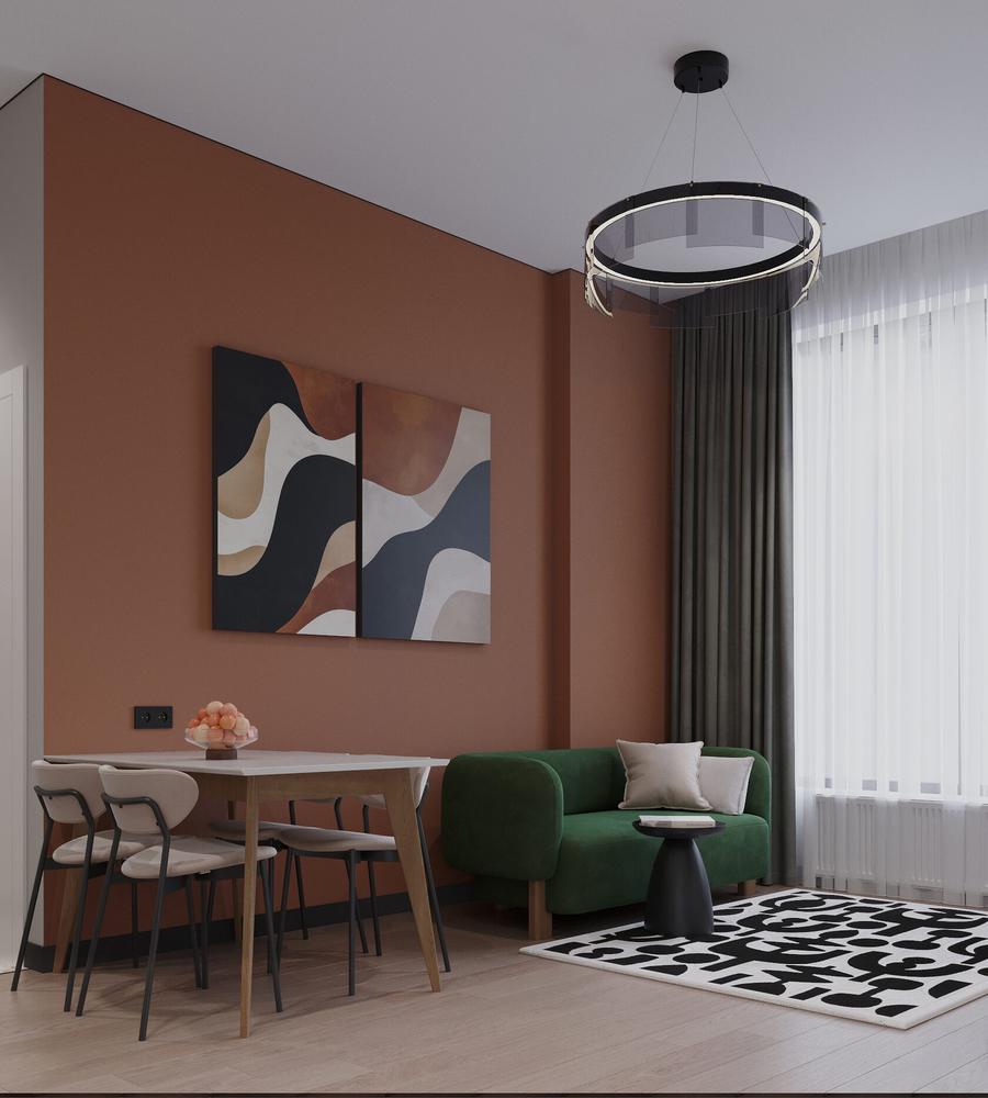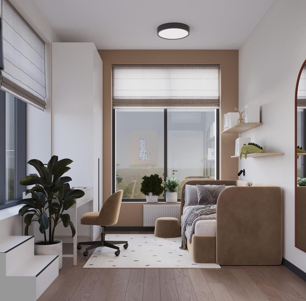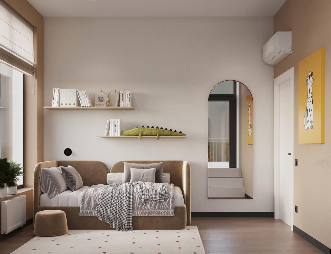 Современный сдержанный интерьер в спокойных тёплых оттенках. Разнообразие достигается за счёт акцентных цветов и материалов.