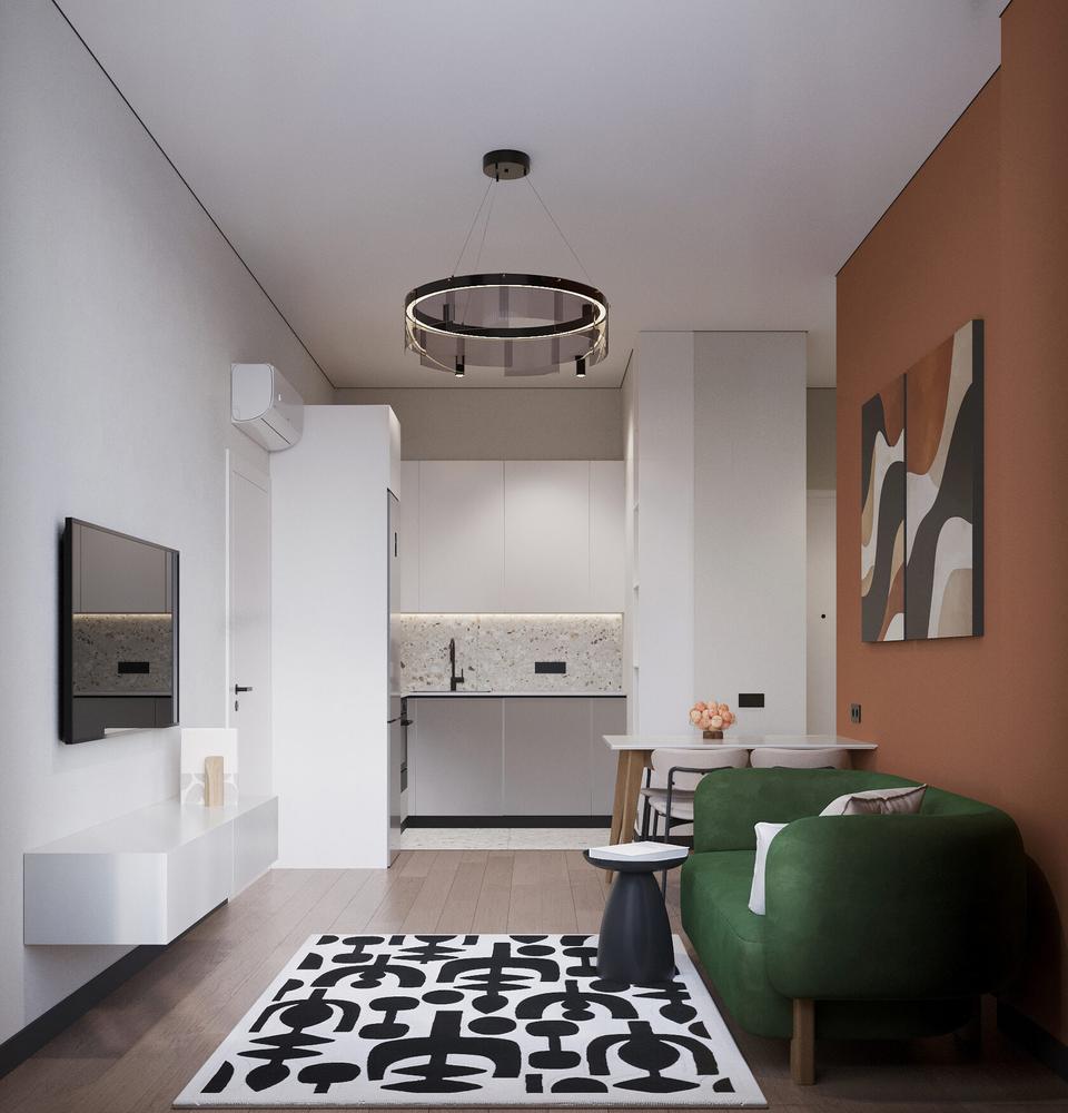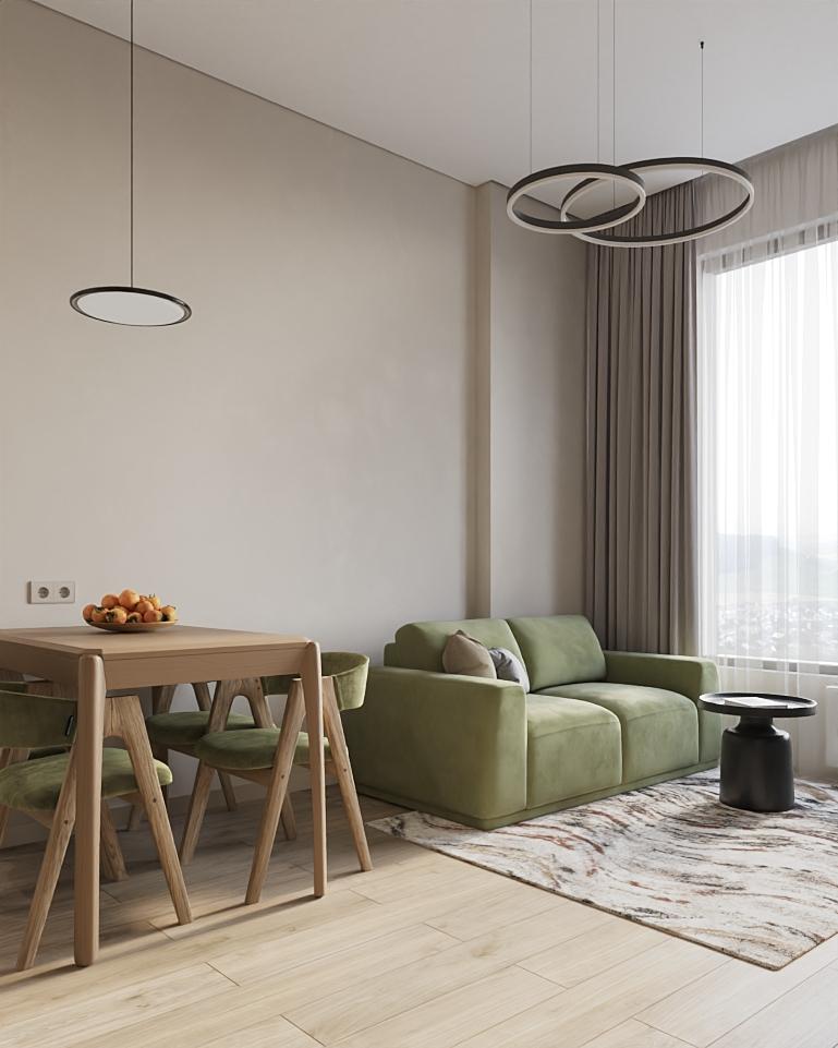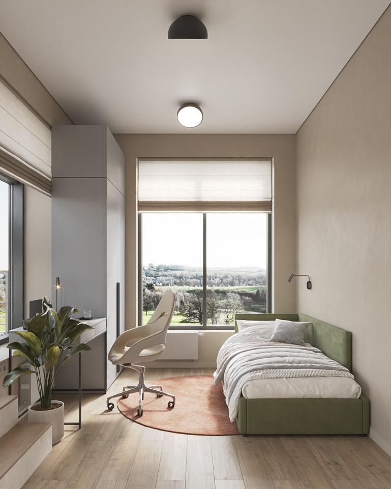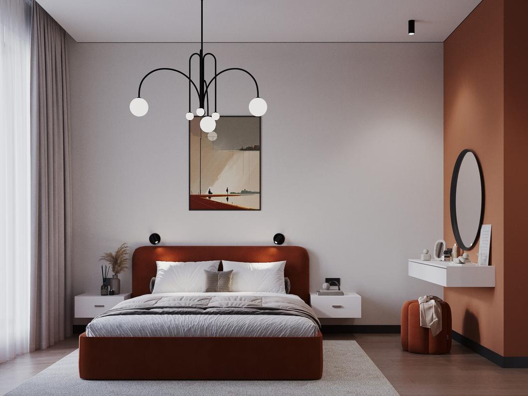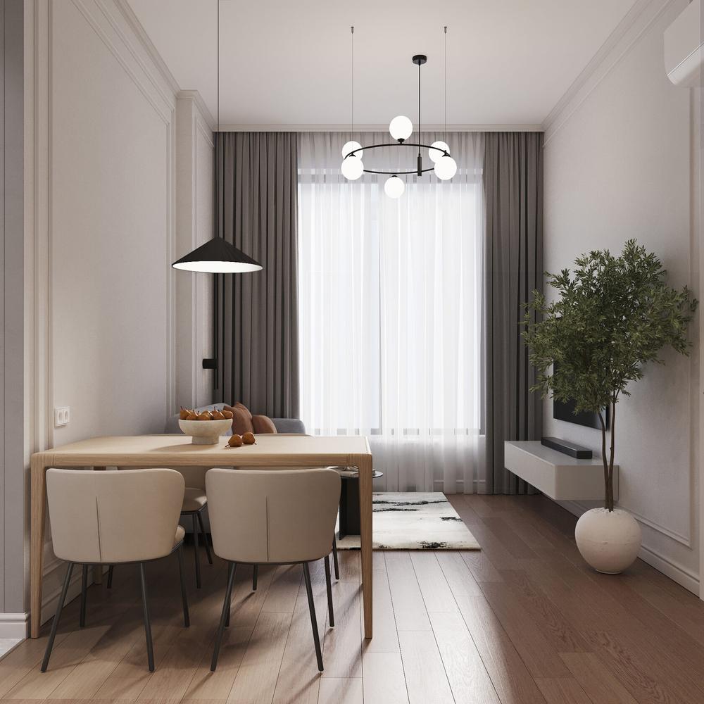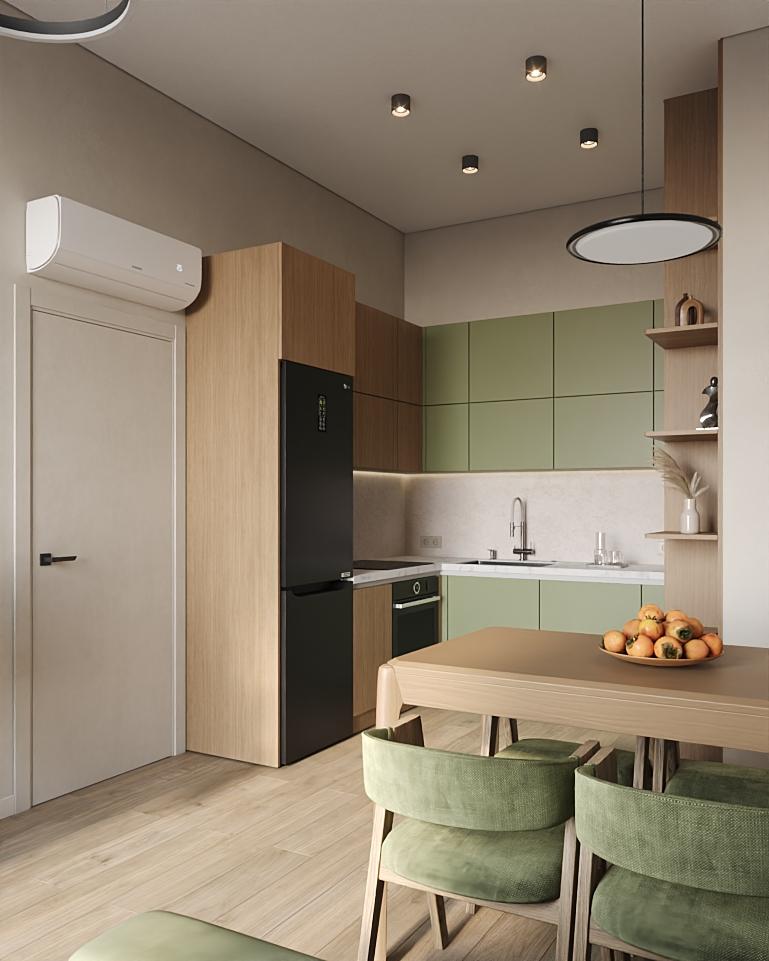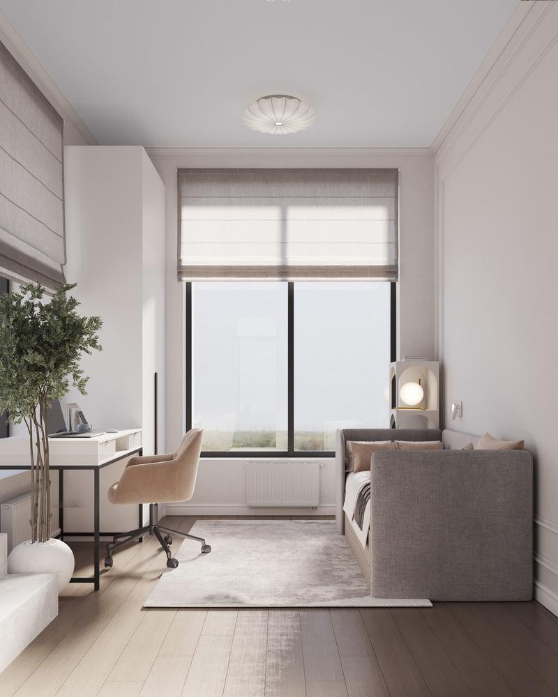 Современный сдержанный интерьер в спокойных тёплых оттенках. Разнообразие достигается за счёт акцентных цветов и материалов.