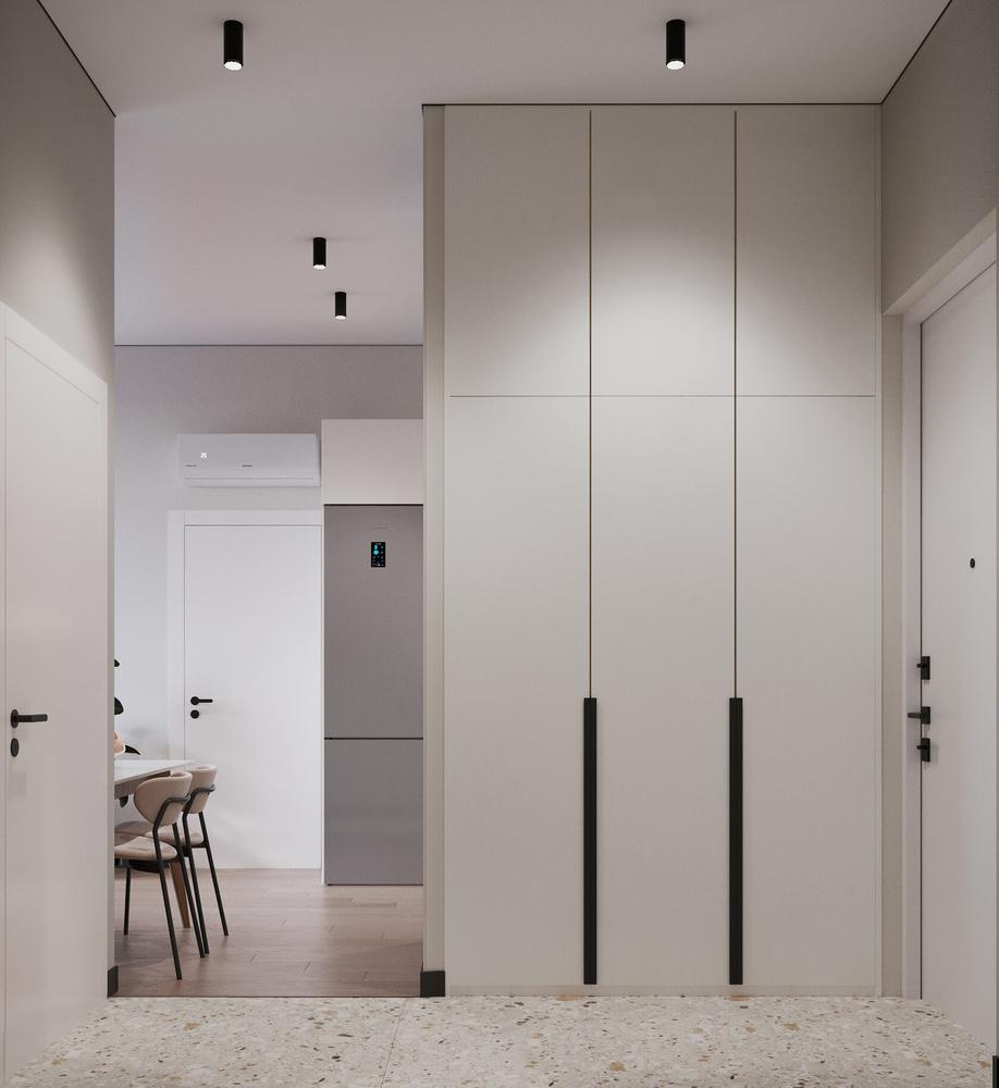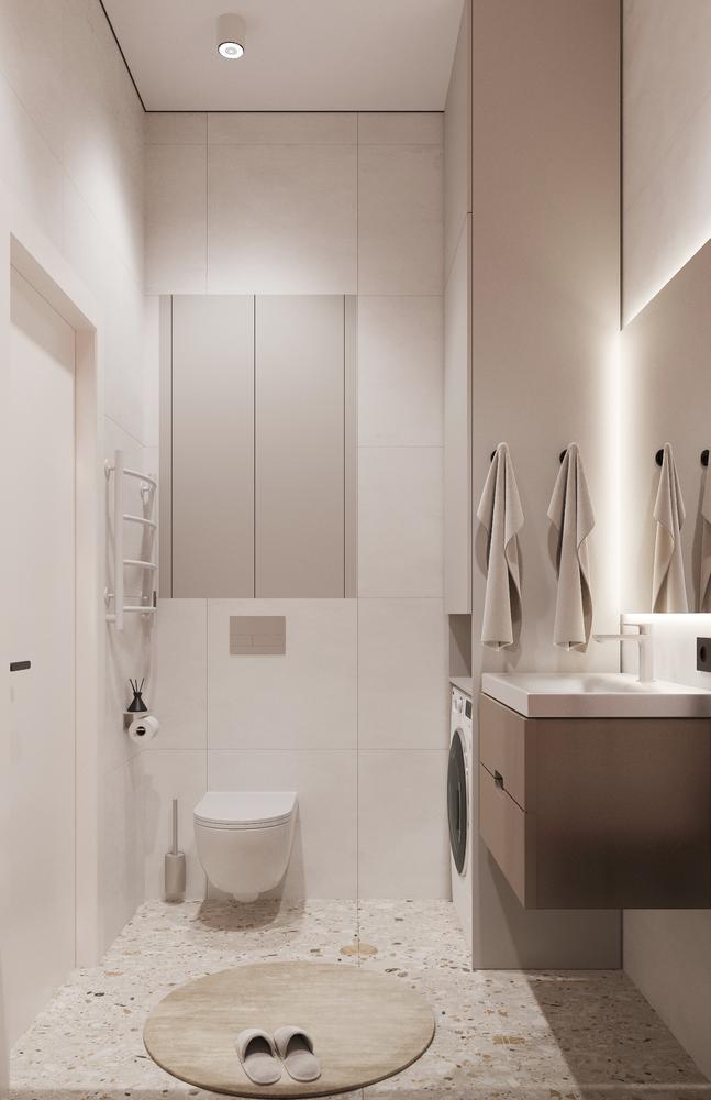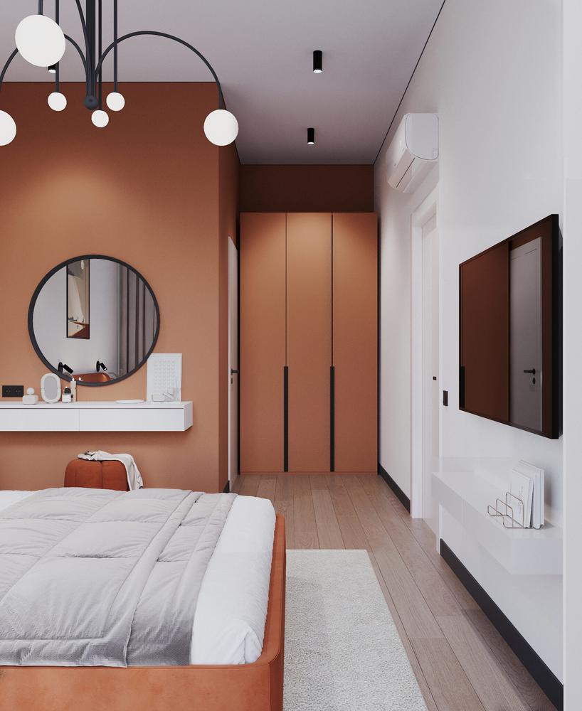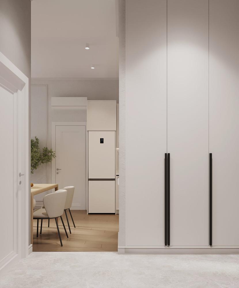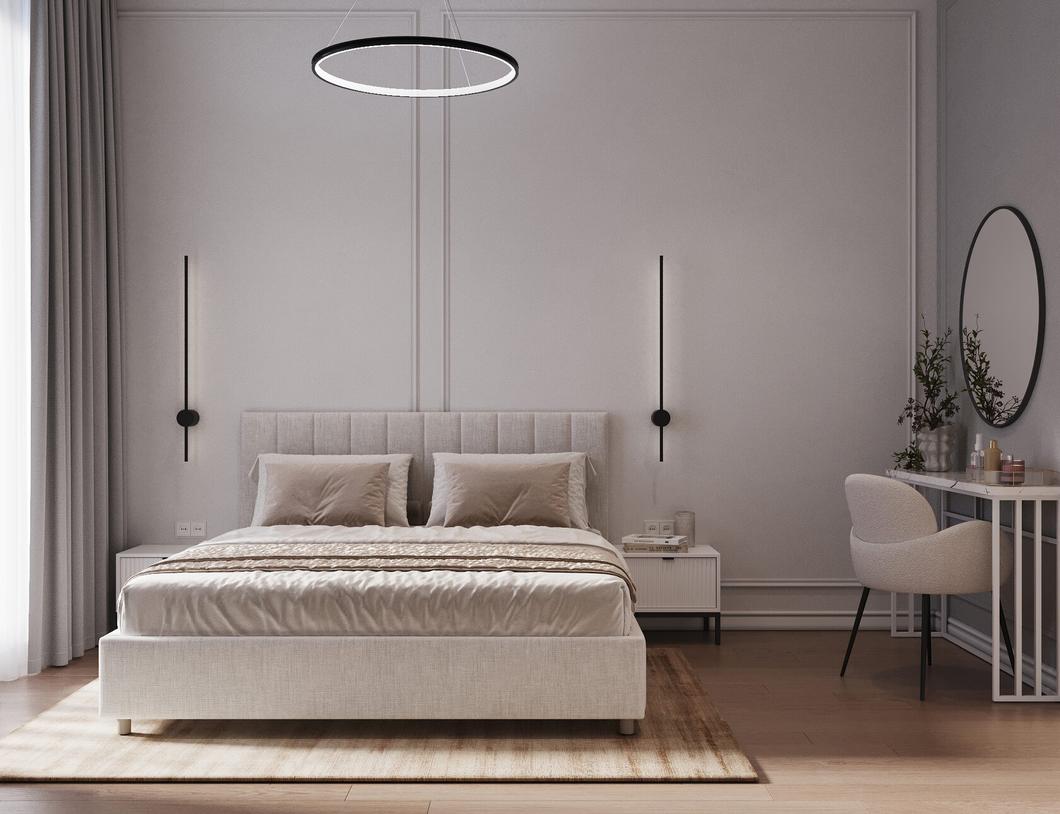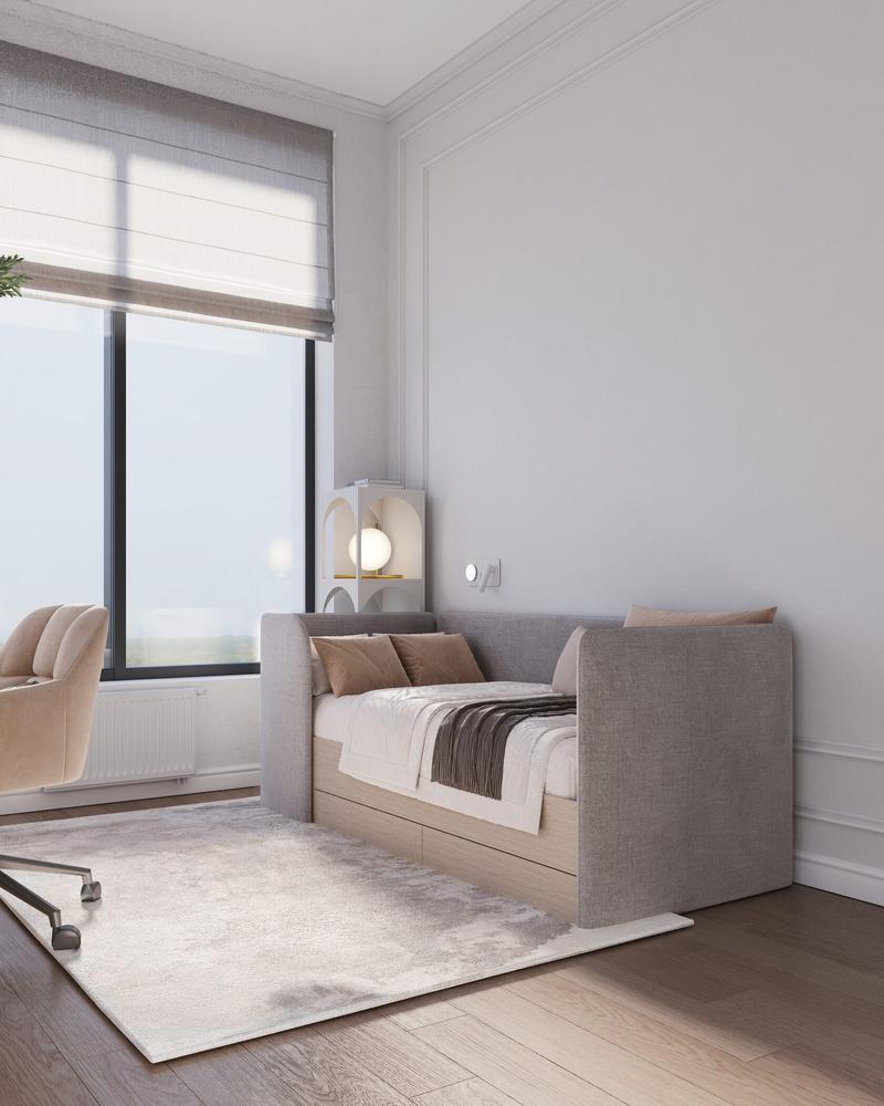 Современный сдержанный интерьер в спокойных тёплых оттенках. Разнообразие достигается за счёт акцентных цветов и материалов.