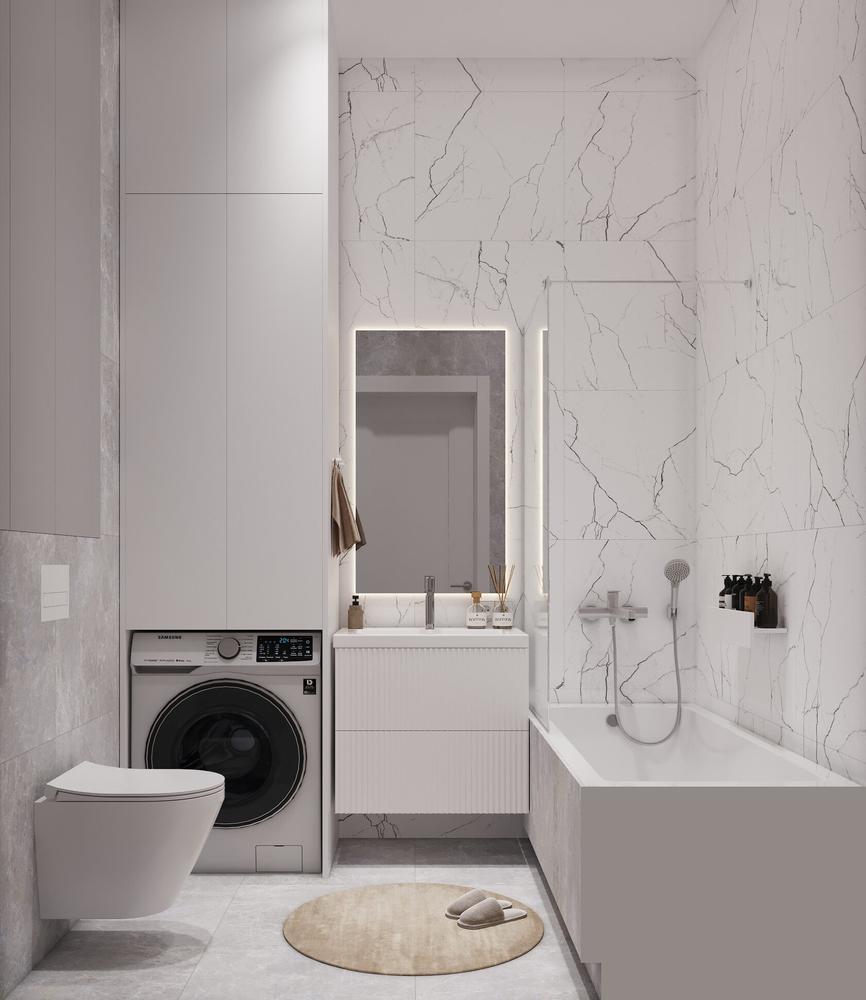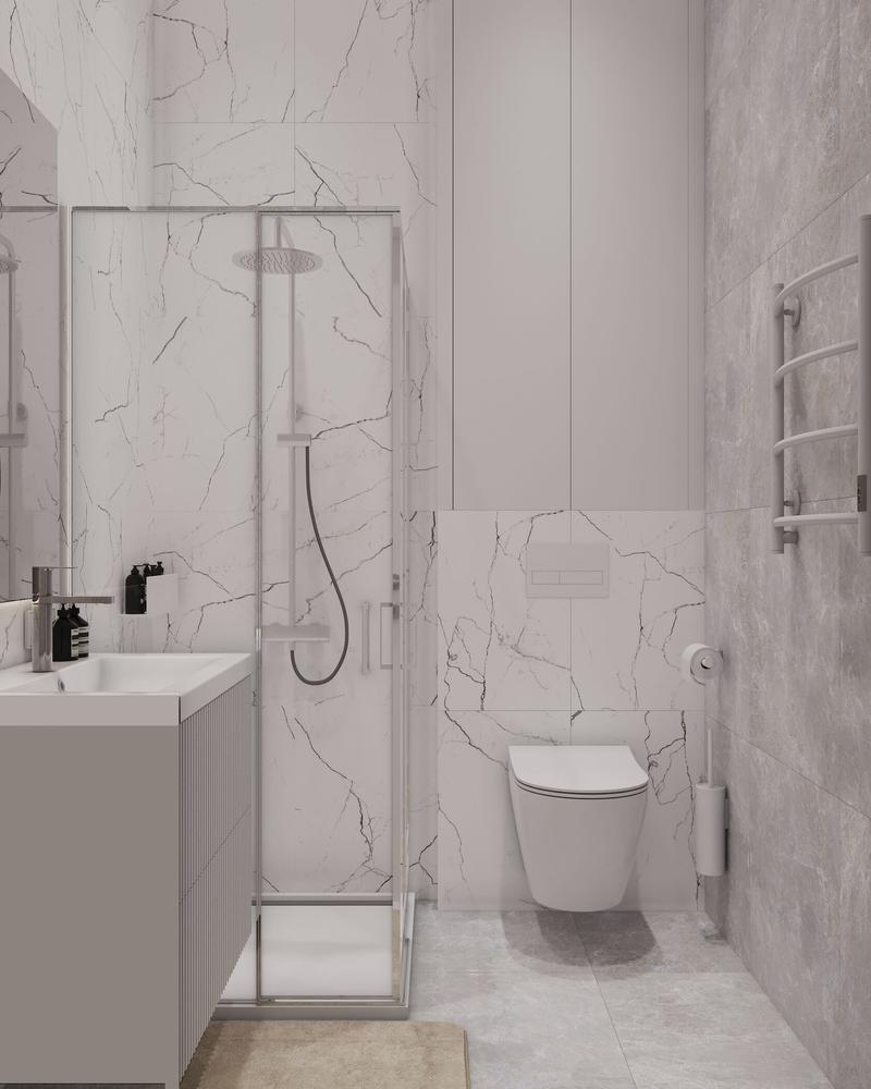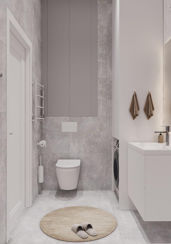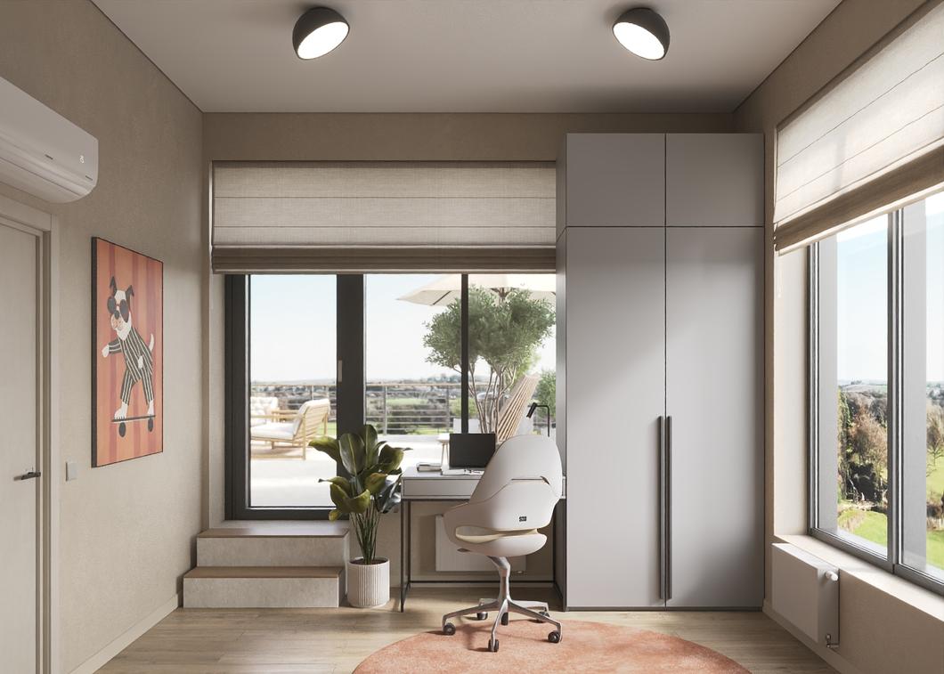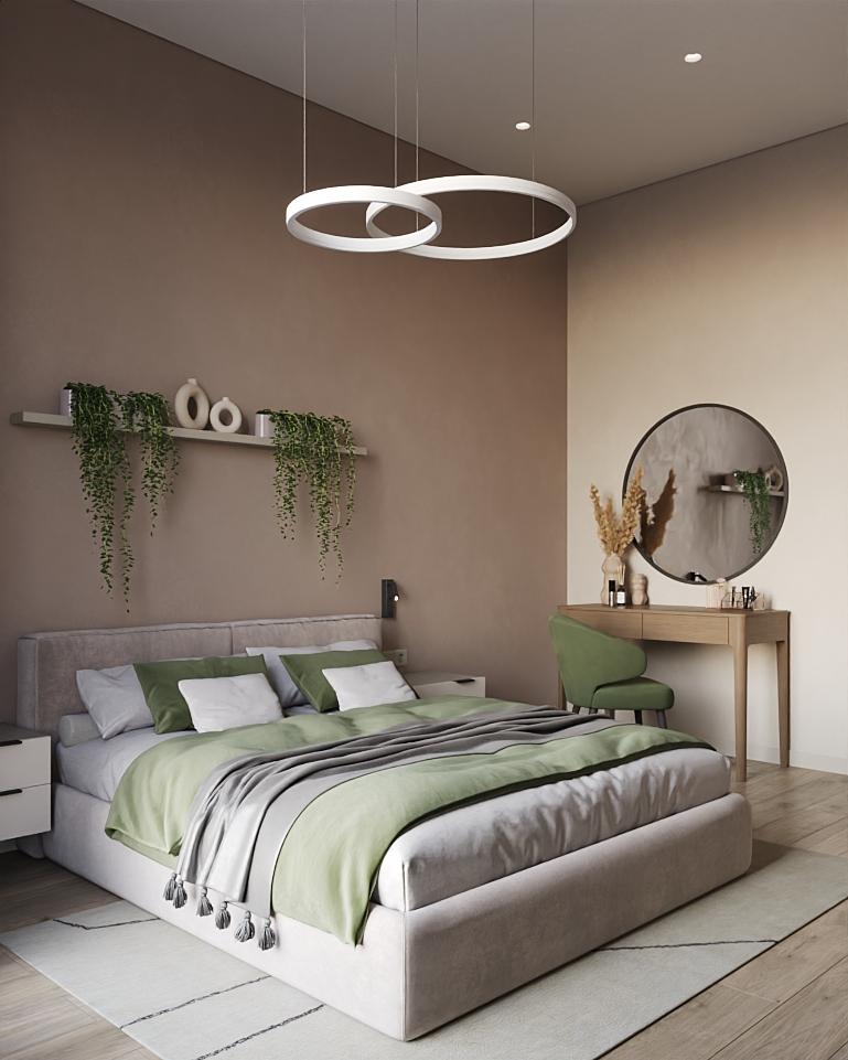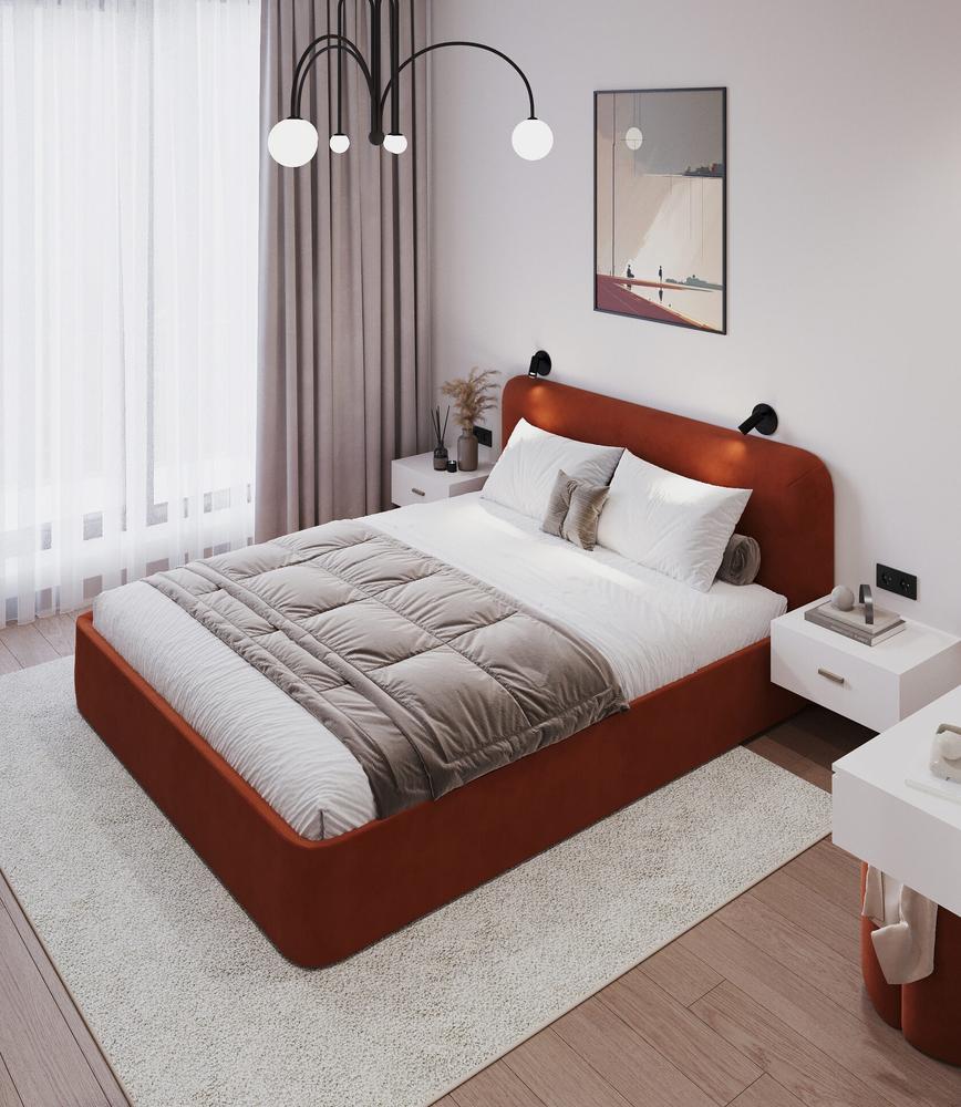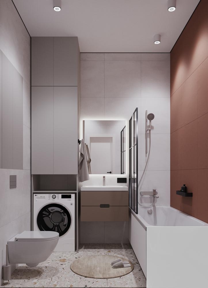Современный сдержанный интерьер в спокойных тёплых оттенках. Разнообразие достигается за счёт акцентных цветов и материалов.