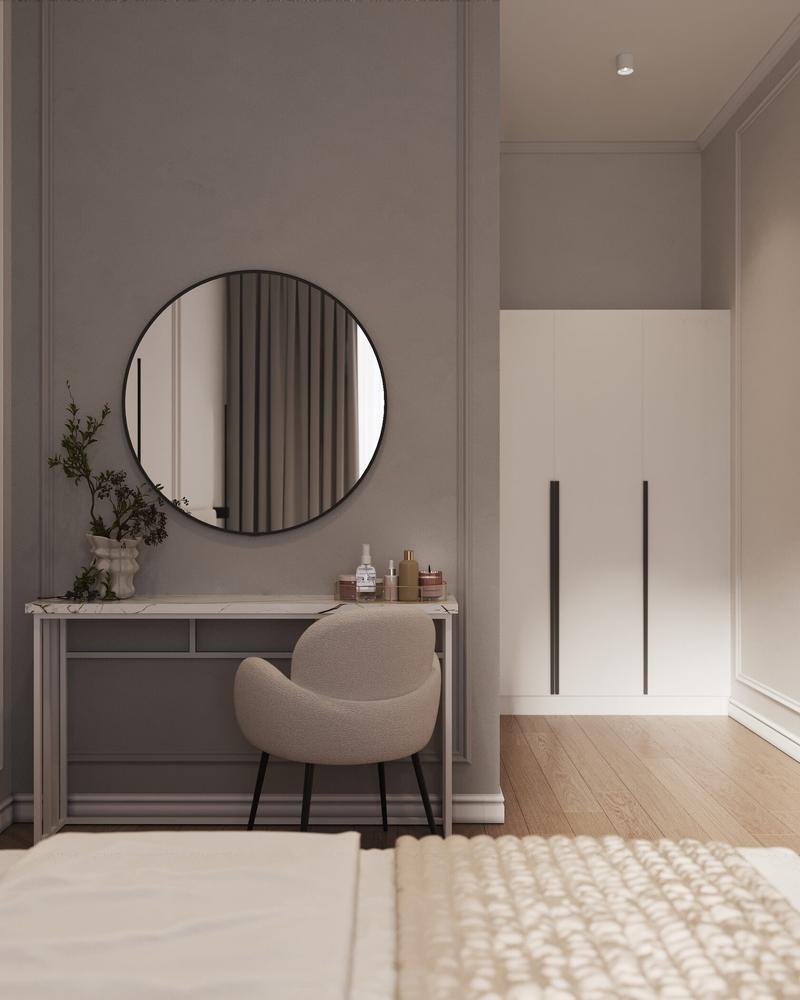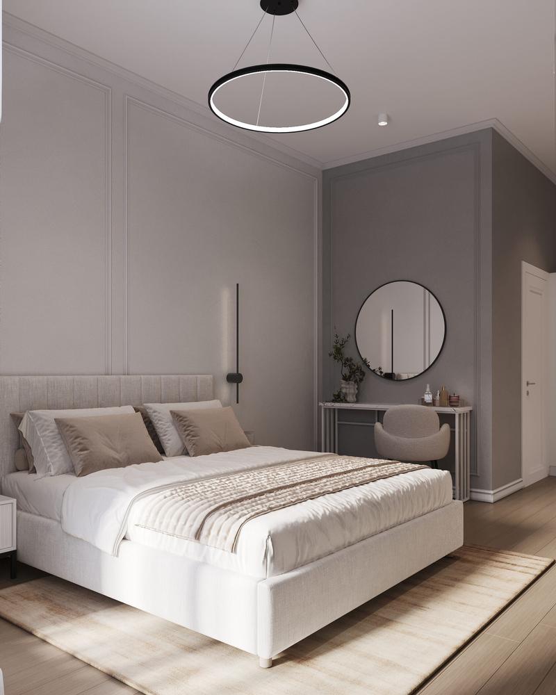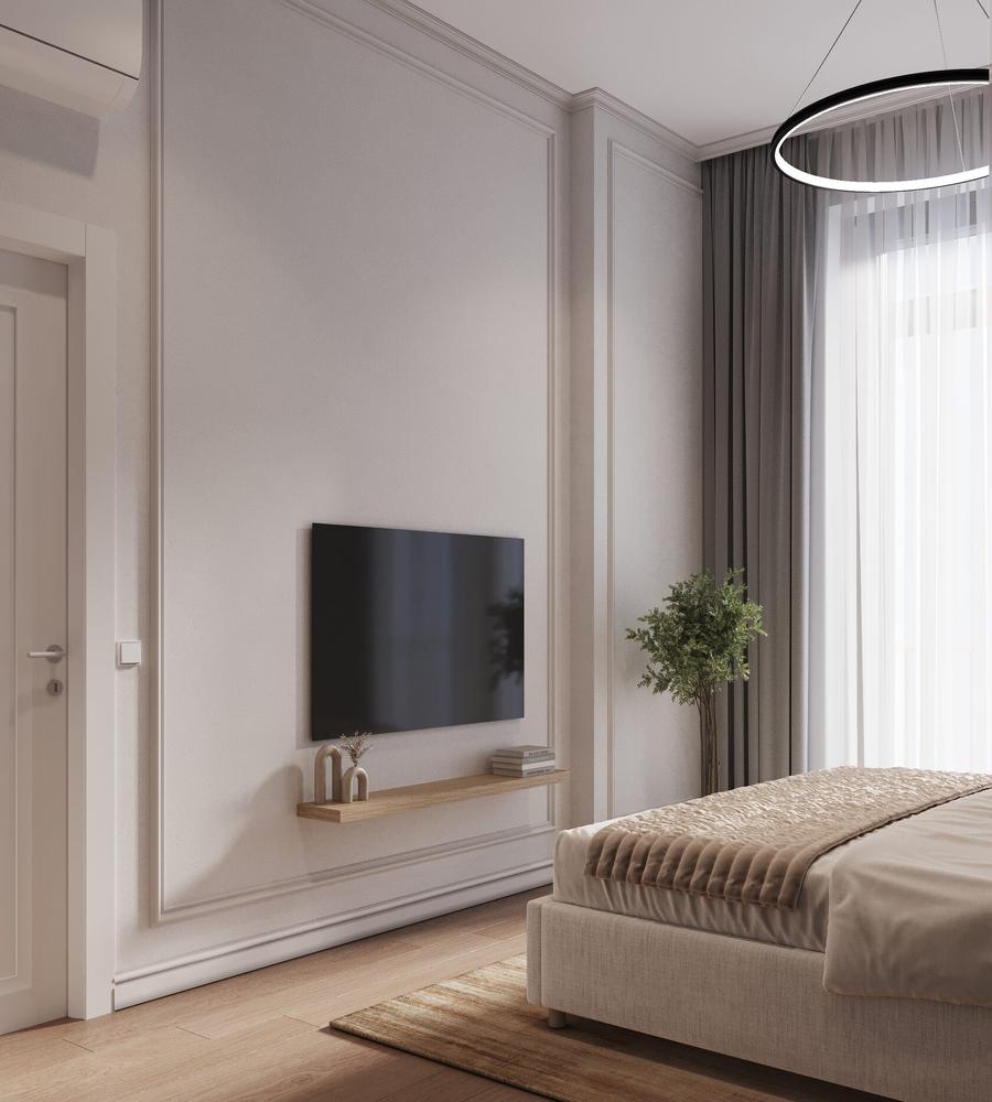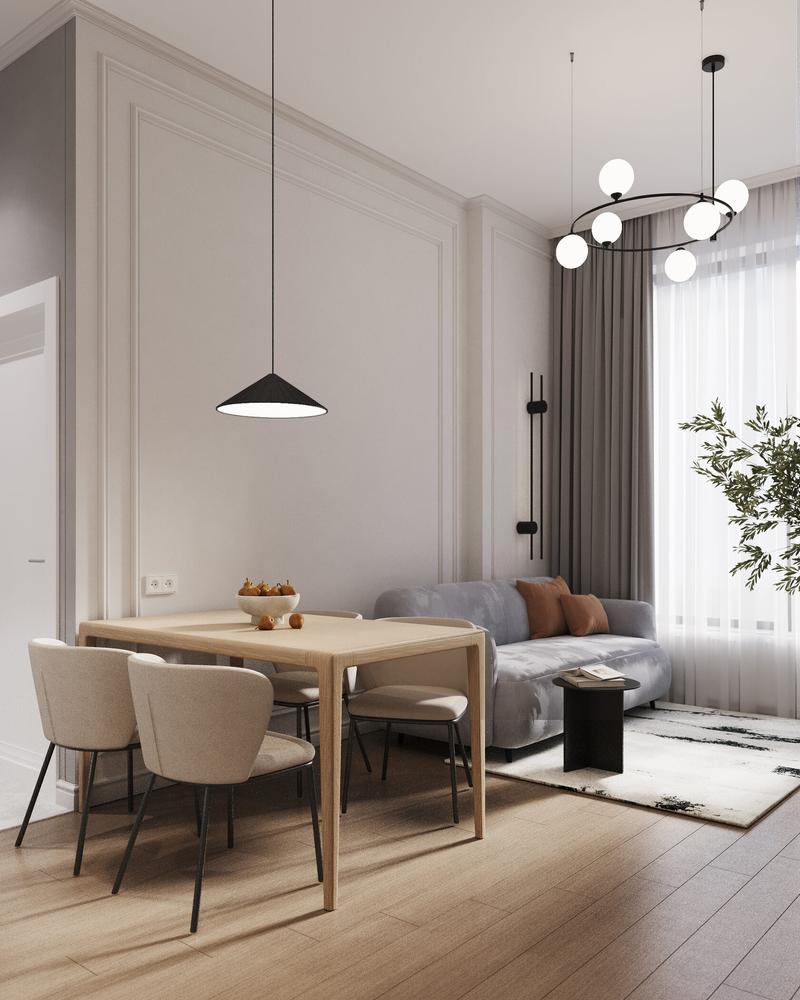Интерьер в классическом стиле, светлый и элегантный с использованием характерных декоративных элементов.